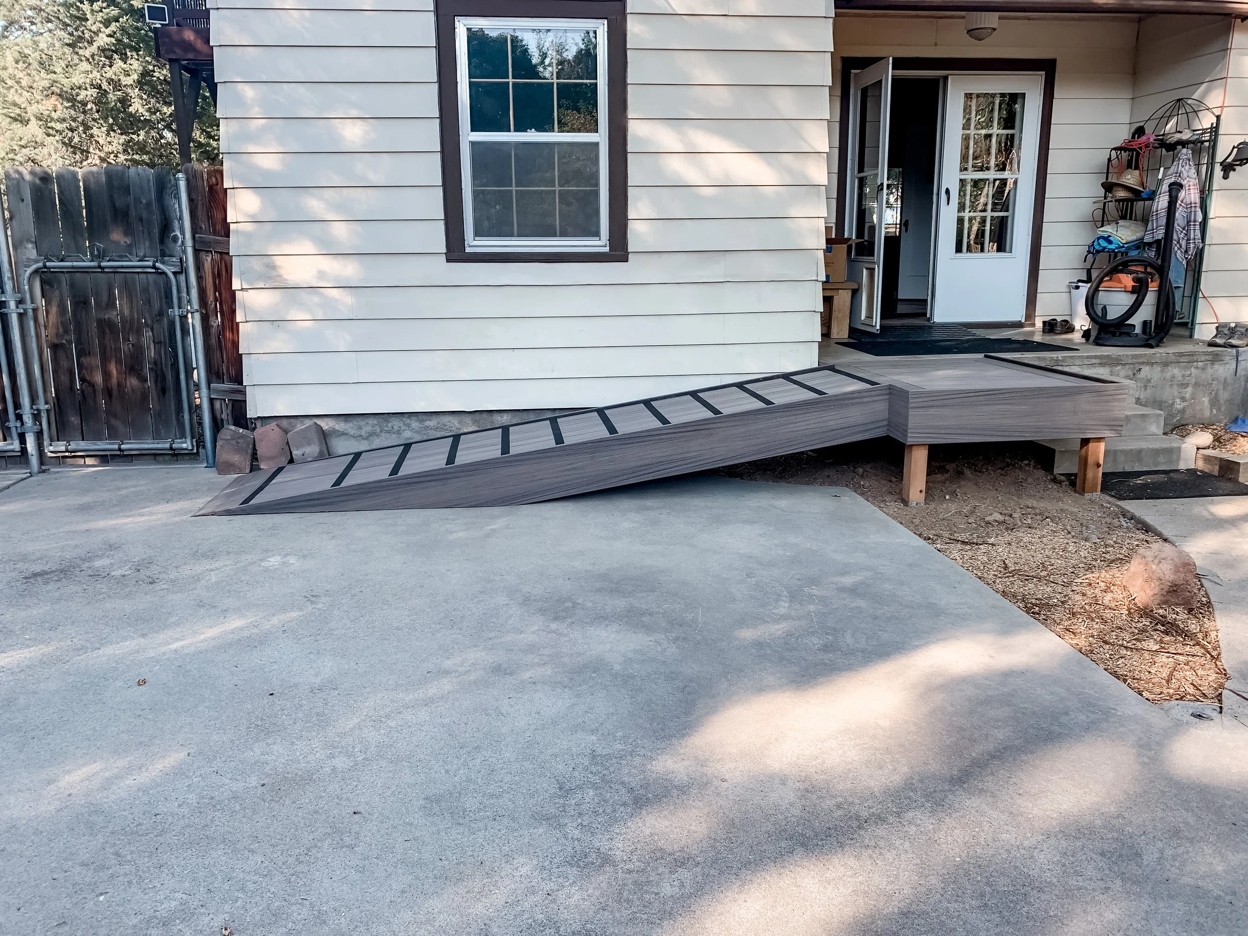 Miscellaneous smaller projects done throughout the Treasure Valley including a wheelchair ramp with landing, front door trim upgrade, baseboards, and shed.